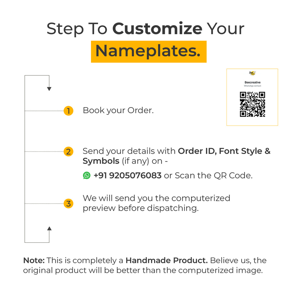 Enhance your Entrance:ย Imagine the elegance of our custom nameplates adorning your entrance. Whether mounted on a door or displayed on a wall, our nameplates add a stylish touch to your space, creating a warm and inviting atmosphere for your guests. Crafted with precision and attention to detail, each nameplate reflects our commitment to quality and craftsmanship, elevating the ambiance of your home or office. With a variety of designs and customization options available, you can truly make your mark and leave a lasting impression.